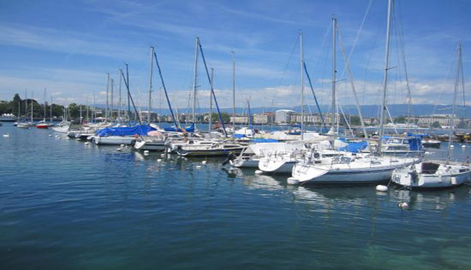 日内瓦湖 (法方称莱芒湖) 是阿尔卑斯湖群中最大的一个。湖面面积约为224平方英里,在瑞士境内占140平方英里,法国境内占84平方英里。湖面形状略似新月,月缺部分与法国东部衔接,湖水漪涟,烟霞万顷,波面似镜,碧蓝清澈。天鹅和水禽搏戏水上,游艇和彩帆游弋湖中。群群白鸽在湖畔倘佯,和平宁静。日内瓦湖中,最引人注目的是一个巨大的人工喷泉,冲天而起的高大水柱,从湖面直射天际,蔚为壮观。自古以来,许多名作家、大诗人都赞美、讴歌过它。亨利·詹姆斯称它是“出奇的蓝色的湖”;拜伦则把它比喻成一面晶莹的镜子,“有着沉思所需要的养料和空气”;巴尔扎克则把它说成是“爱情的同义词”。今日,在港湾两边绿树掩映之间建起的一栋栋漂亮的别墅和豪宅,又给日内瓦湖增添了几分秀色。